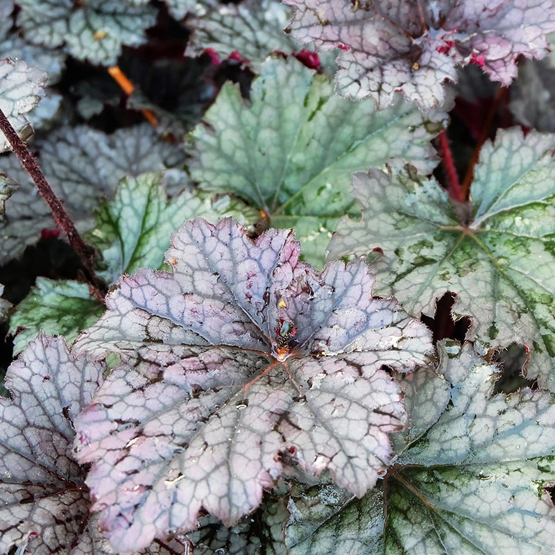 Alunrot Heuchera ‘Plum Pudding’ har ett brokigt silverrosa bladverk som sitter kvar länge under höst och vinter. Passar som kontrast till blåvioletta eller vita planteringar och lyser upp i höstens krukor