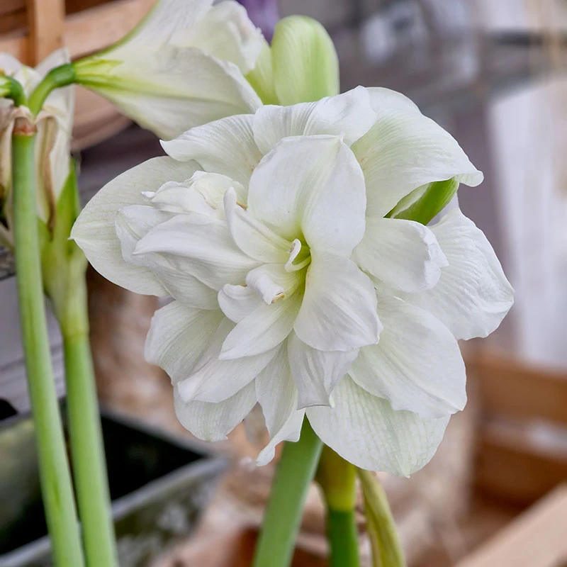Amaryllis ‘Alfresco’ – En vinterjuvel som gnistrar med snövita kronblad i flera lager och ett limegrönt svalg. Lång blomningtid.