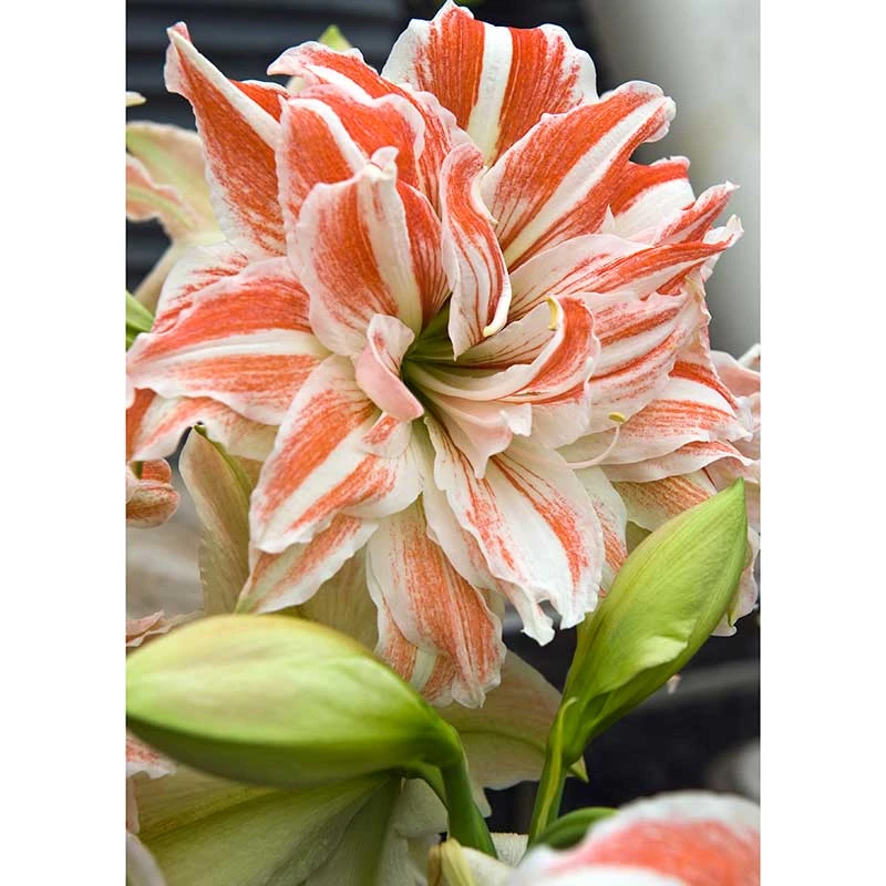 Amaryllis ‘Dancing Queen’ – Dubbelblommande amaryllis med aprikosröda, vackert ådrade kronblad. Lång hållbarhet och utsökt från knopp till fullt utslagen blomma.
