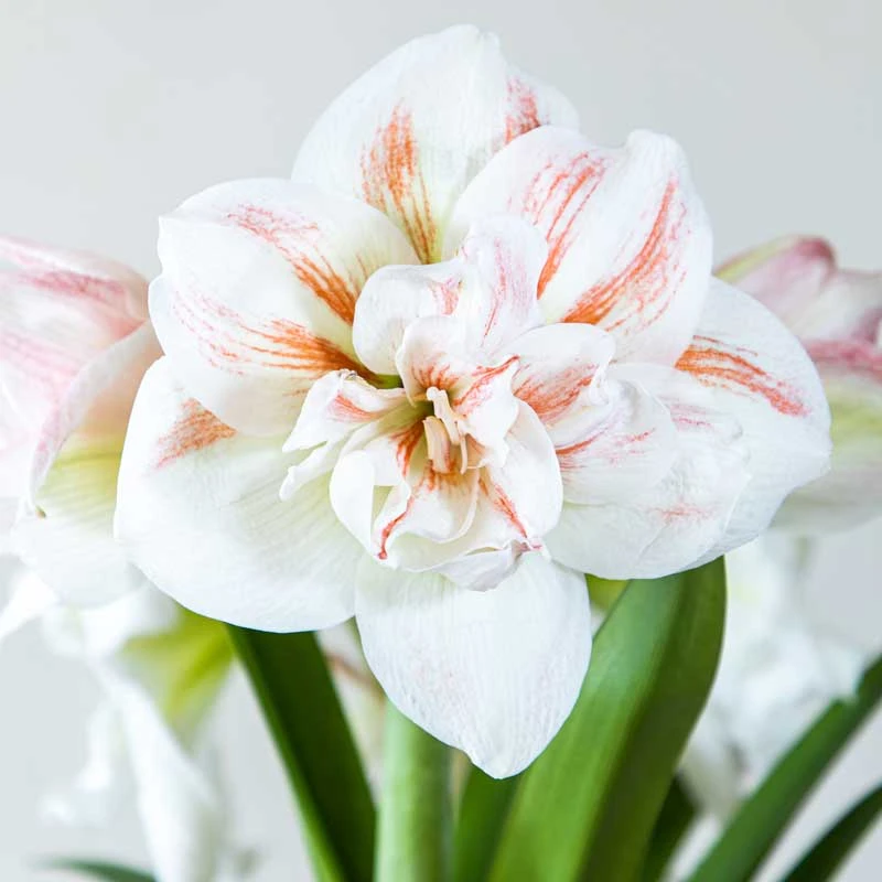 Dubbel, fylld, storblommande och mäktig amaryllis. Mamma till flera sorter med rena färger. Unikt lite mjukt fluffigt utseende med rundade kalkblad. Ofta fyra blommor per stängel med en dameter på 22 cm.