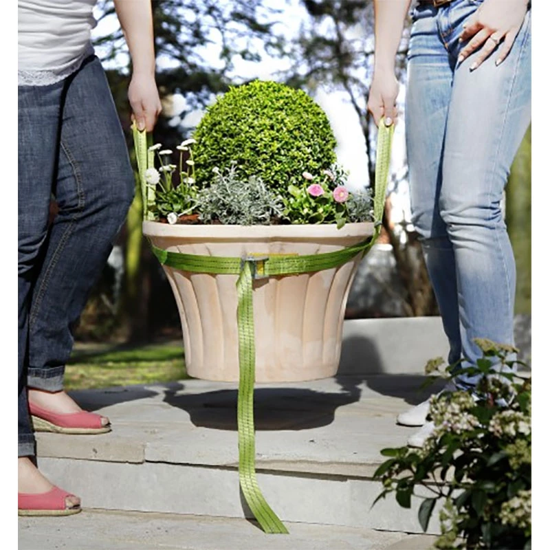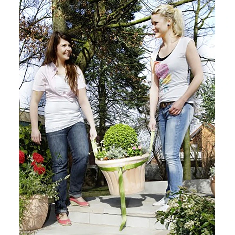 Två handtag som gör det lätt för två personer att lyfta krukan. Praktiskt spänne för att reglera längden på bältet. UV-beständigt.