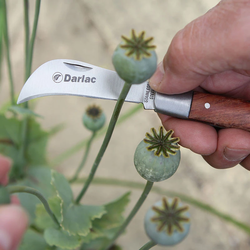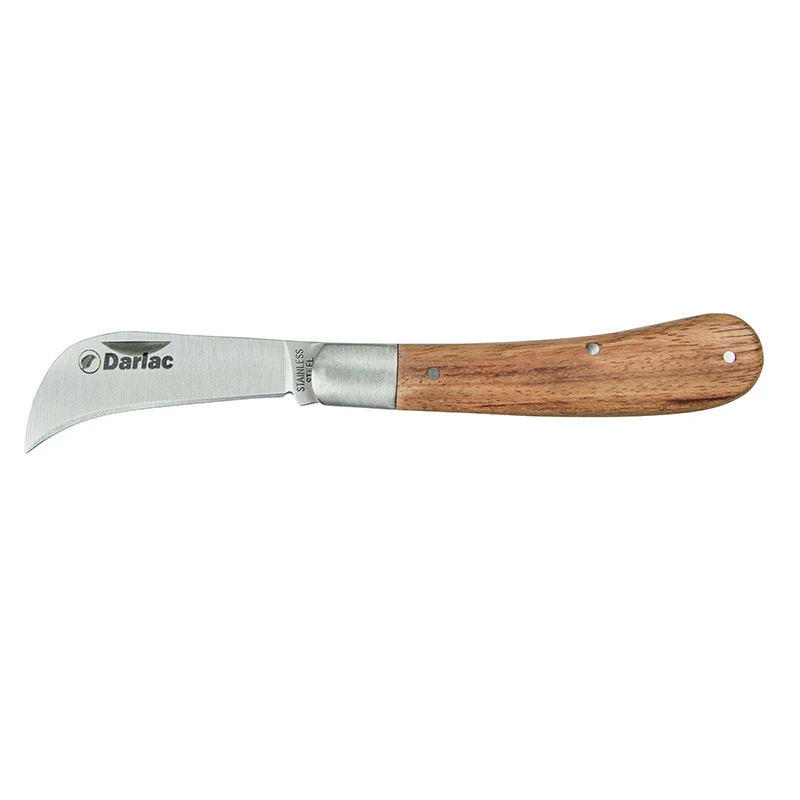 Darlacs fällbara beskärningskniv har ett trähandtag som ger ett traditionellt utseende och en skön känsla i handel.