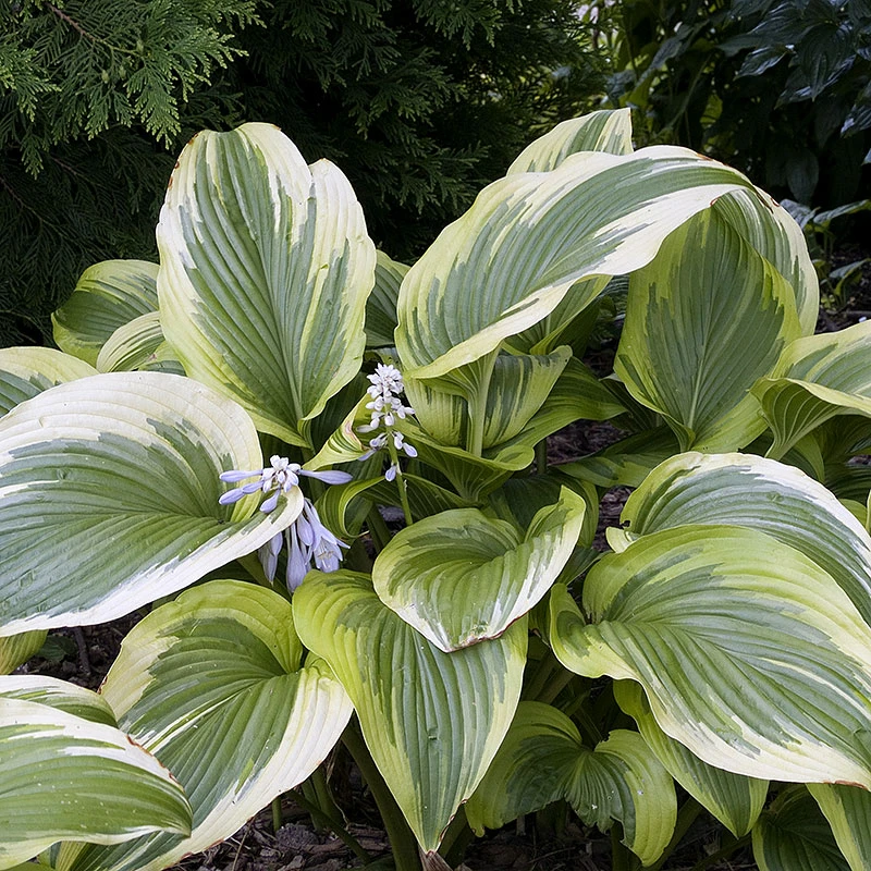 Hosta fortunei ‘Aureomarginata’ får breda mellangröna blad med vackert cremegula kanter. Mycket odlingsvärd. Har vunnit Award of Garden Merit of Royal Horticultural Soceity
