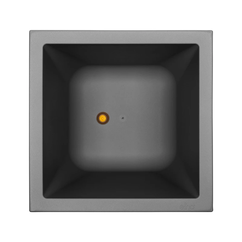Kruka med ett naturligt utseend och fyrkantig design med dolda hjul för enkel förflyttning. Krukan är anpassad för både inom- och utomhusbruk, med en bottenplugg som enkelt tas bort vid användning utomhus.