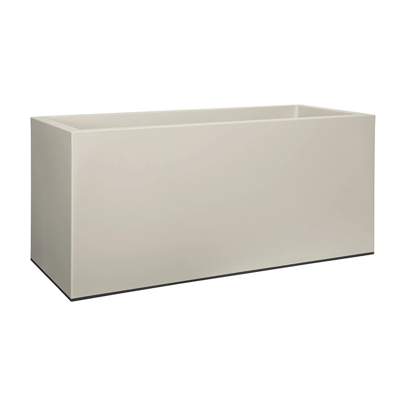 Kruka med ett naturligt utseend och rektangulär design med dolda hjul för enkel förflyttning. Krukan är anpassad för både inom- och utomhusbruk, med en bottenplugg som enkelt tas bort vid användning utomhus.