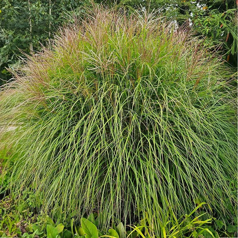 Glansmiskantus ‘Ferner Osten’ är jättevackert som solitär med sina fluffiga vippor med färger från rött till rosa.