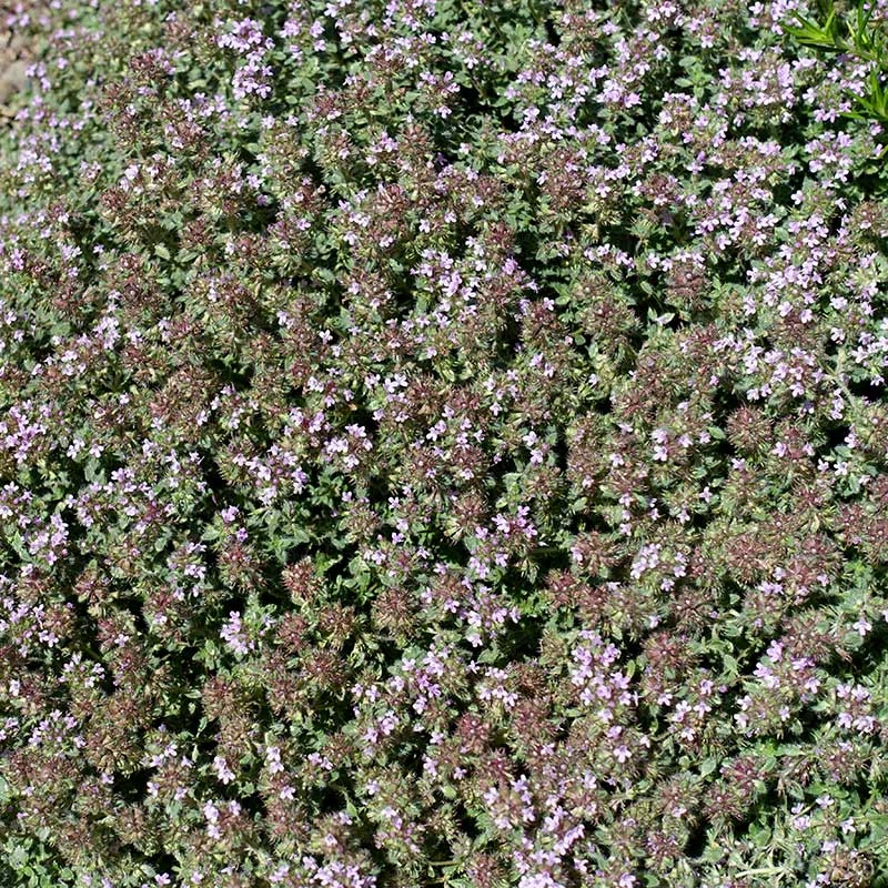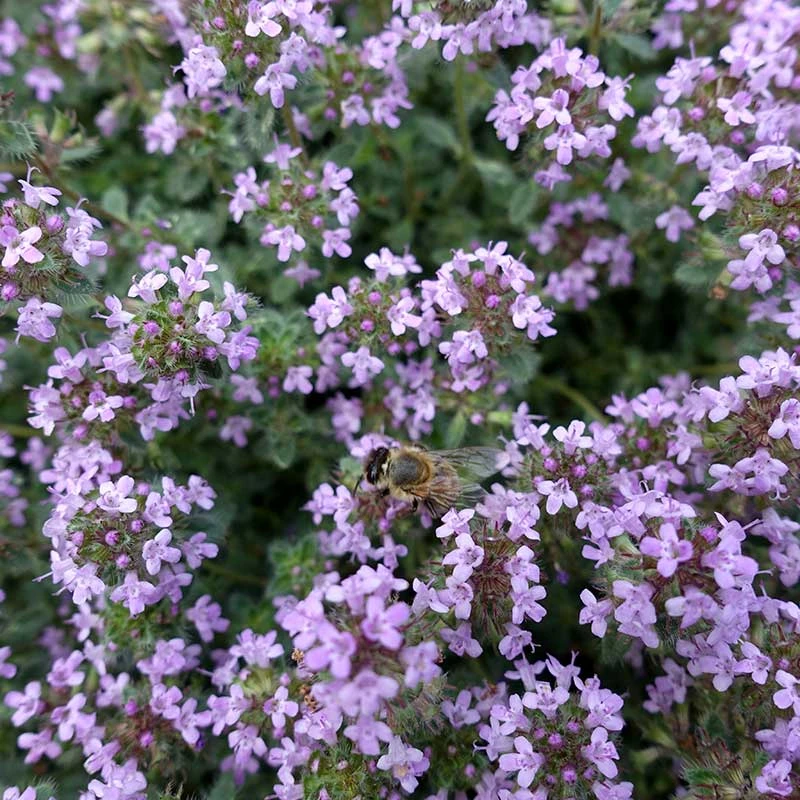 Gråtimjan är en mycket låg, krypande växt som bildar kompakta mattor. Användbar i stenpartiet eller på murar. Blommar rikligt i maj-juni med små lilarosa blommor. Får vackert silvergrönt bladverk. Uppskattas av bin och fjärilar. Höjd ca 5 cm. Trivs i full sol på kalkrik, väldränerad jord. Bästa marktäckaren av timjanarterna. Omtyckt av bin.