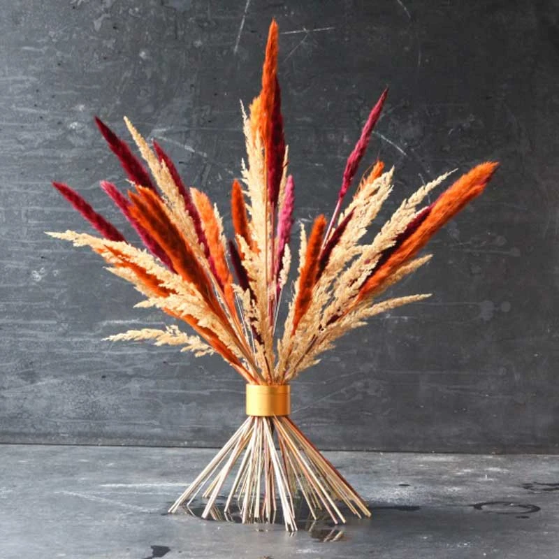 - Har du tunna stjälkar kan du göra små knippen av dem, gärna där materialet placeras på olika nivå för att skapa variation. Sätt en liten bit tejp längst ner om knippena så blir det enklare att sticka igenom.