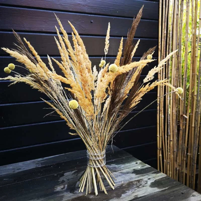 - Har du tunna stjälkar kan du göra små knippen av dem, gärna där materialet placeras på olika nivå för att skapa variation. Sätt en liten bit tejp längst ner om knippena så blir det enklare att sticka igenom.