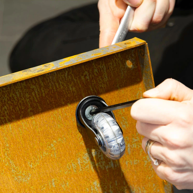 Använd handskar när du hanterar den orostade krukan. Det förhindrar fingeravtryck på materialet som kan synas när krukan senare rostar. För montering av hjulsatsen behöver du en torxnyckel nr 5 och en hylsnyckel nr 13. När du köper krukan är den orostad eller i början av sin rostning. Det tar upp till två år innan krukan är färdigrostad, beroende på väder och vind. När krukan fått sin gyllenbruna färg avstannar rostningen och krukan har ett skyddande lager som förhindrar genomrostning. Cortenstål är mycket hållbart.