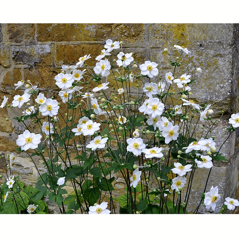 Höstanemon ‘Honorine Jobert’ är en högrest perenn med luftigt, buskigt växtsätt. Den har vita, enkla blommor med gul mitt och vackra mörkgröna treflikiga blad. Fylligt och vackert bladverk.