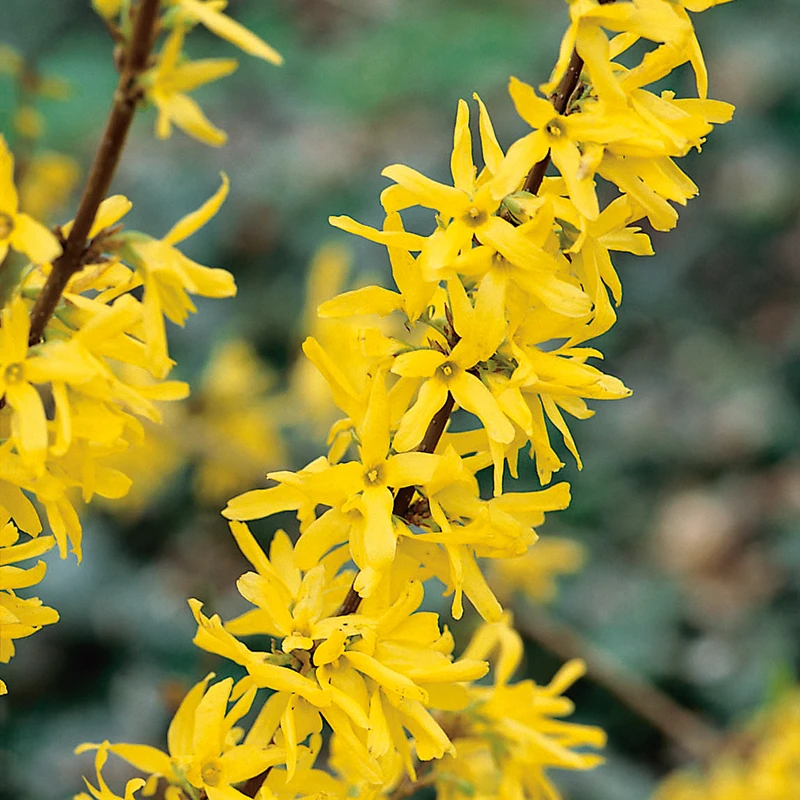 Forsythia blir översållad av vackra guldgula blommor på bar kvist i apr./maj. Den är en av de tidigaste färgklickarna i våra trädgårdar. Den har ett brett buskigt växtsätt med ljusgröna blad. Den trivs på de flesta jordar men föredrar väldränerade varma jordar i sol till halvskugga. grenarna kan klippas och drivas under vårvintern till vackert blommande ris inomhus. Beskärning görs under perioden juli-sept. (JAS) genom föryngringsbeskärning där man gallrar ut gamla grenar ända ner till basen. fullvuxen blir den 2-3m hög och lika bred. Passar bra som solitär eller i grupp.