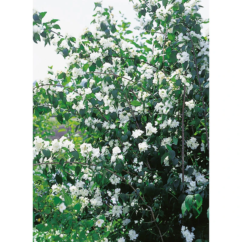 Kameliaschersmin är en gammal klassiker. Blommar med massor av vita vackra dubbla doftande blommor i juni-juli. Vindtålig sort. Gallra bort äldre grenar för rikare blomning. Schersmin blir ca 2 -3 meter hög och 1,5-2 meter bred tät upprättväxande. Trivs på de flesta jordar. Kameliaschersmin är en bra alternativ till vanlig doftschersmin eftersom den blommar länge och har upprätt växtsätt.
