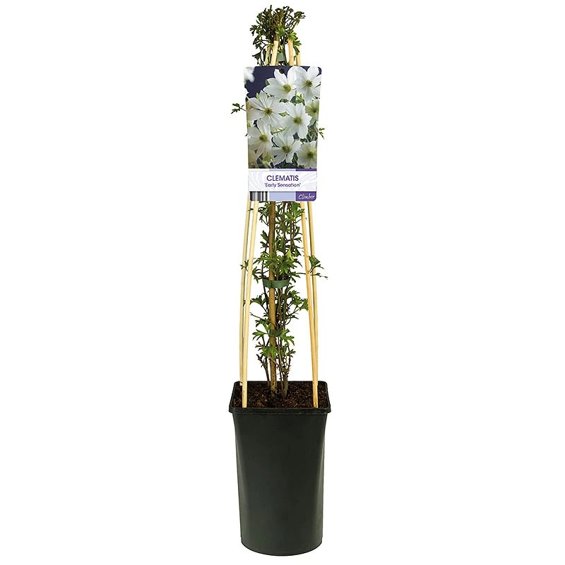Klematis ‘Early Sensation’ en tidigt blommande vackert sort. Sorten har stora vita ljust gröna och doftande blommor. Passar perfekt att odla i kruka, som elegant terrass växt.