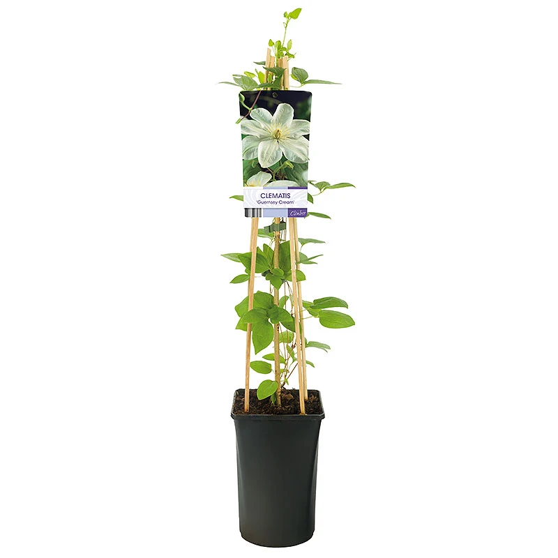 Klematis ‘Guernsey Cream’ är en sort som blommar rikligt med ljusgula (krämvita) blommor med grönt streck i mitten och gula ståndare. Blommar första gången i juni på gammal ved och andra gång i augusti-september på ny ved. Passar perfekt att odla mot vägg, träd, mur, spaljé och även i kruka.
