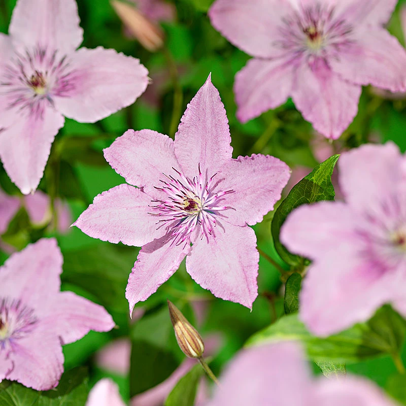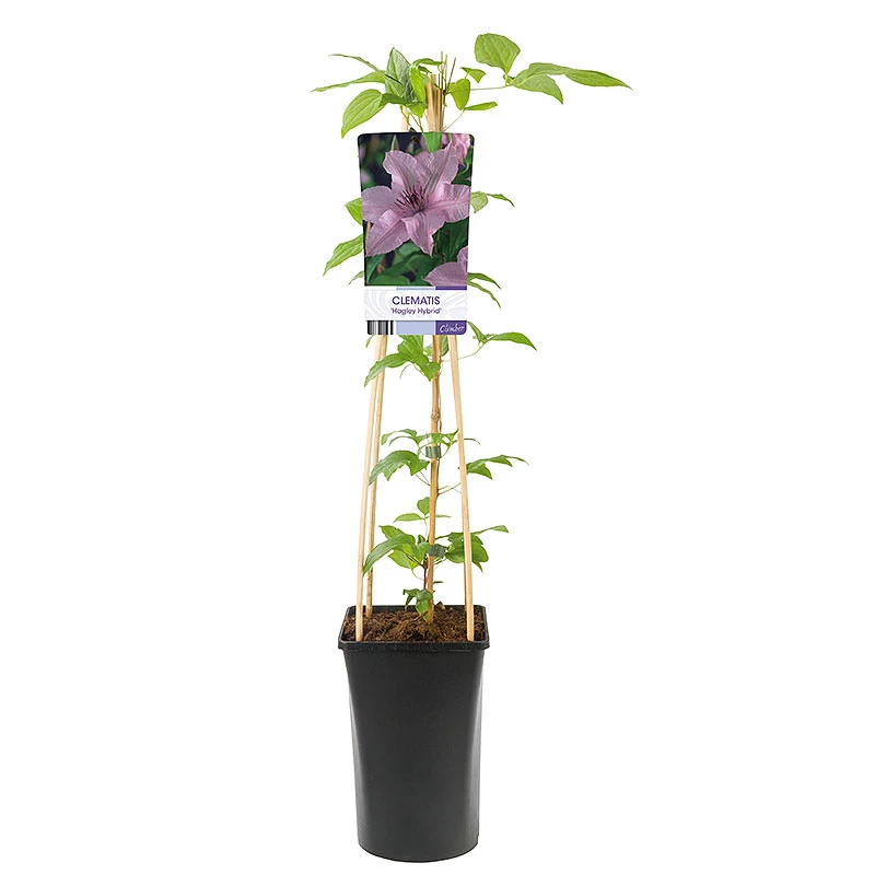 Klematis ‘Hagley Hybrid’ är en sort med stora (10-15 cm), rosa blommor med brunvita ståndare. Växer bäst i halvskugga. Sort som är bra att odla i kruka. Plantera med storbladiga perenner för att skugga rothalsen.