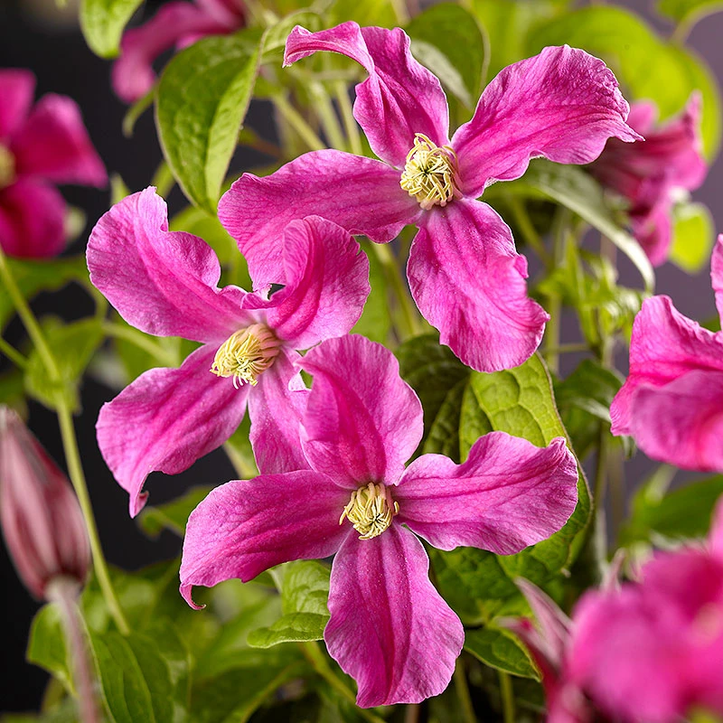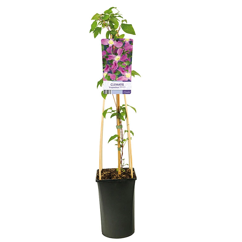 Klematis ‘Inspiration’ har mörkrosa blommor med gula ståndare som blommar rikligt under lång period. Denna sort klättrar inte utan behöver stöd för att växa. Passar perfekt att odla i kruka på en uteplats eller balkong. Skydda rothalsen på våren mot solen.