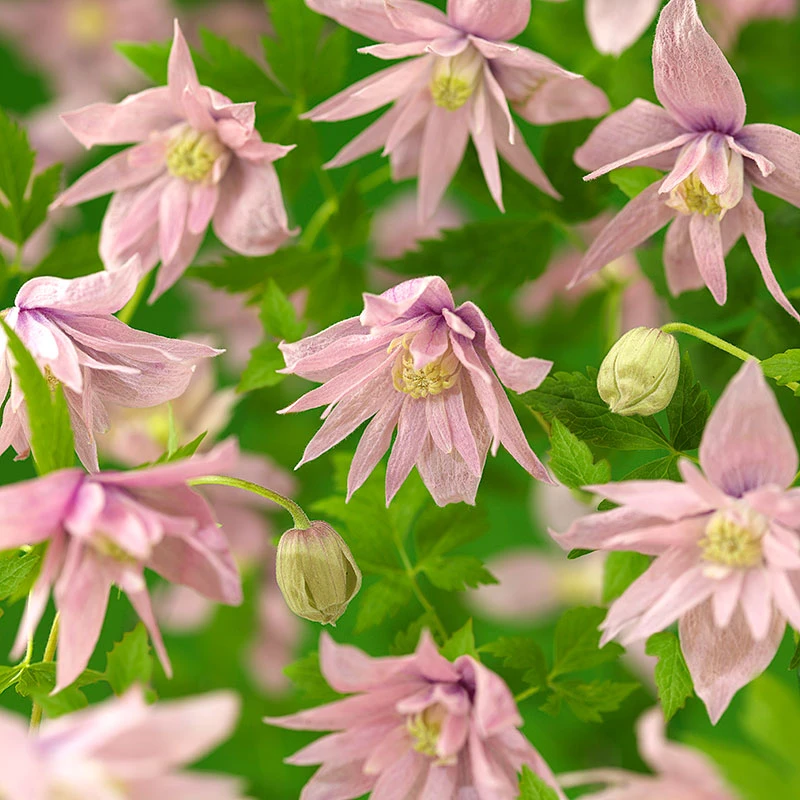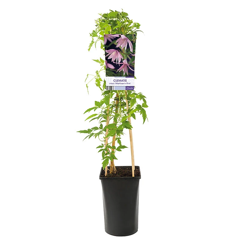 Klematis ‘Markham’s Pink’ har klockformade, halvdubbla rosa blommor med gult ståndare, under april till juni. Passar perfekt att odla mot vägg, träd, mur eller spaljé.