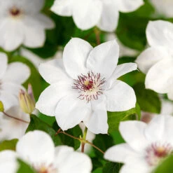 Klematis ‘Miss Bateman’ är en äldre storblommig sort med vita blommor med rödviolett ståndare. Plantera med storbladiga perenner för att skugga rothalsen. Passar perfekt att odla mot vägg, träd, mur eller spaljé.