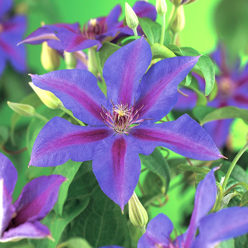 Klematis ‘Mrs N. Thompson’ är en riktigt stark färgkombination. Blommar med blåvioleta stora (ca 15 cm) blommor med rödlila stäcka på varje blomblad. Blommar från maj till augusti.