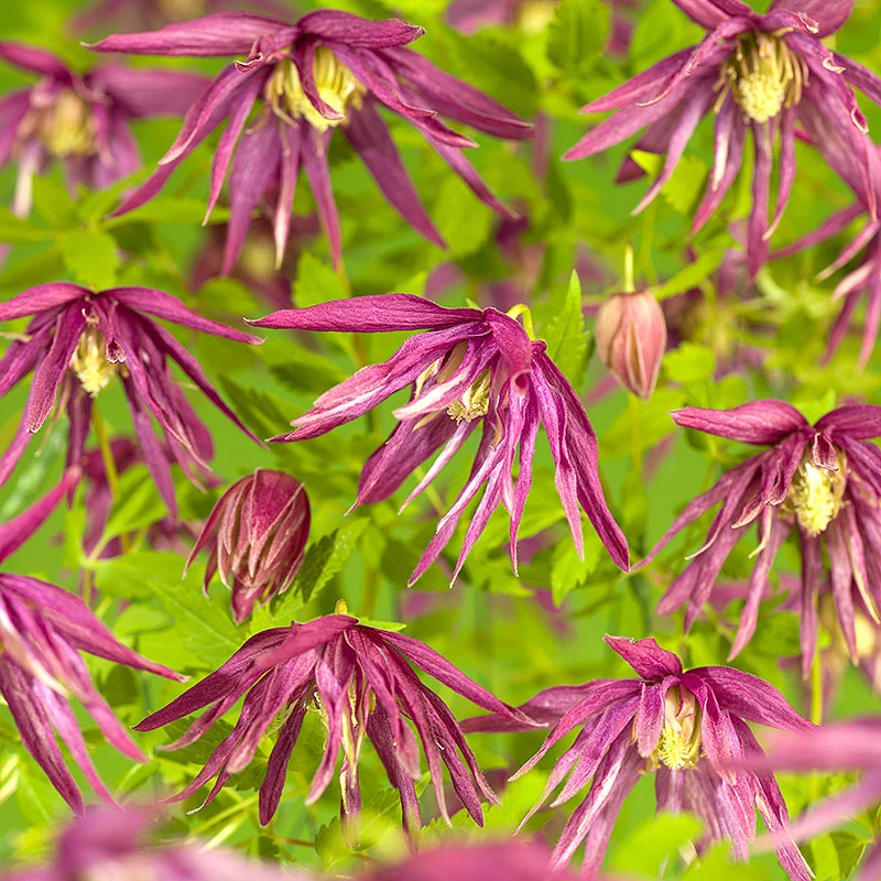 Klematis ‘Octopus’ är en tidigt blommande sort med rödlila, spikiga kronblad (spindellika) med halvdubbla blommor. Blommar kraftig från maj till juni. Passar perfekt att odla mot vägg, träd, mur eller spaljé.