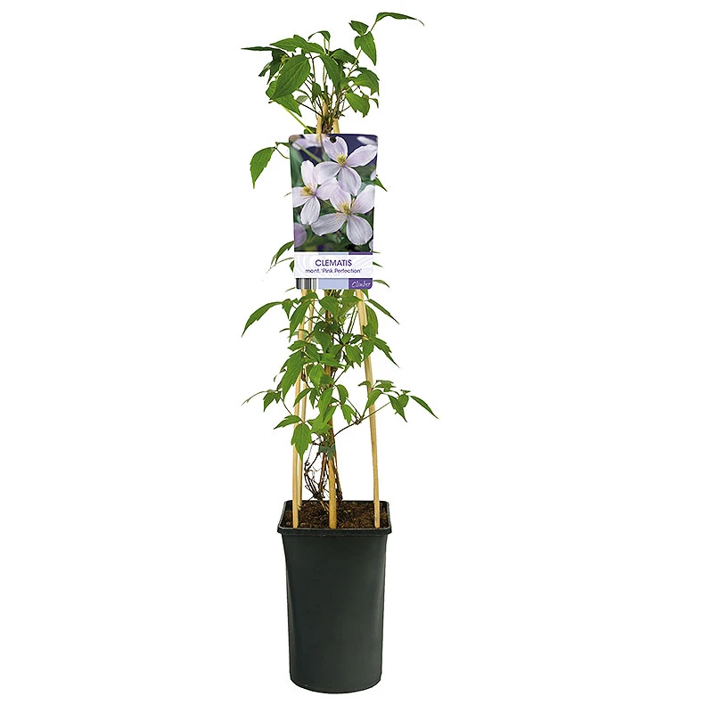 Klematis ‘Pink Perfection’ är en sort med små, rosa och enkla blommor som blommar under juni-juli. Skydda rothalsen på våren mot sol och på vinter mot kyla. Har en fint doft. Passar perfekt att odla mot vägg, träd, mur eller spaljé.