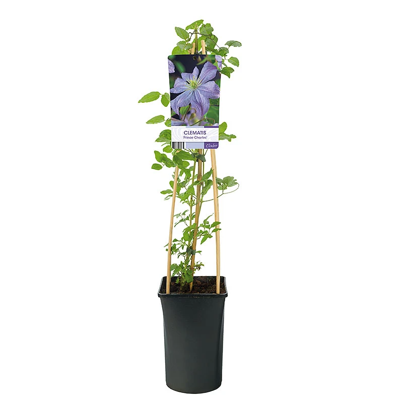 Klematis ‘Prince Charles’ är en storblommiga (8-12 cm) sort med enkla, blåvioletta blommor. Sorten är rikblommig från juli till september. Passar perfekt att odla mot vägg, träd, mur eller spaljé. Passar även bra i kruka.