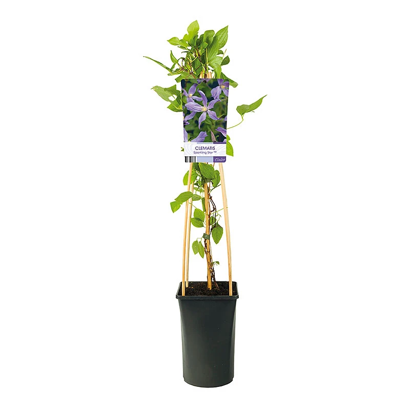 Klematis ‘Sparkling Star’ blommar med medelstora, lila, enkla blommor. Blek violett på kanterna av blomblad och mörkare violettblå i mitten av varje blomblad, gulvita ståndare. Beskärning sker under tidig vår till 30 cm över marken. Passar perfekt att odla mot vägg, träd, mur eller spaljé.
