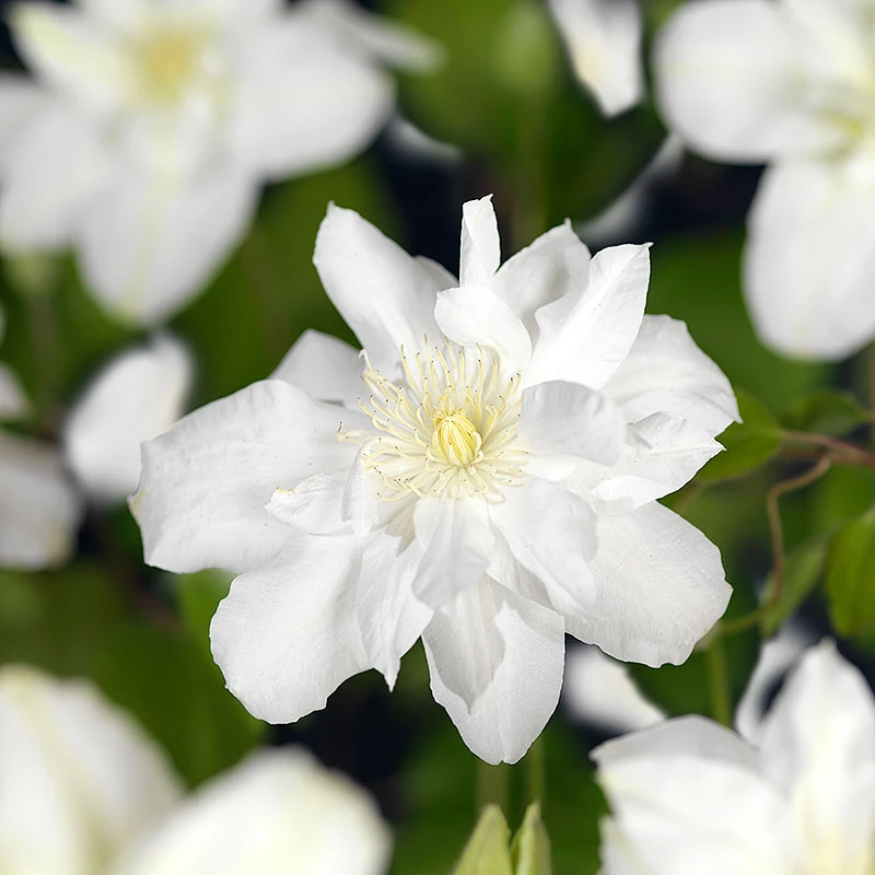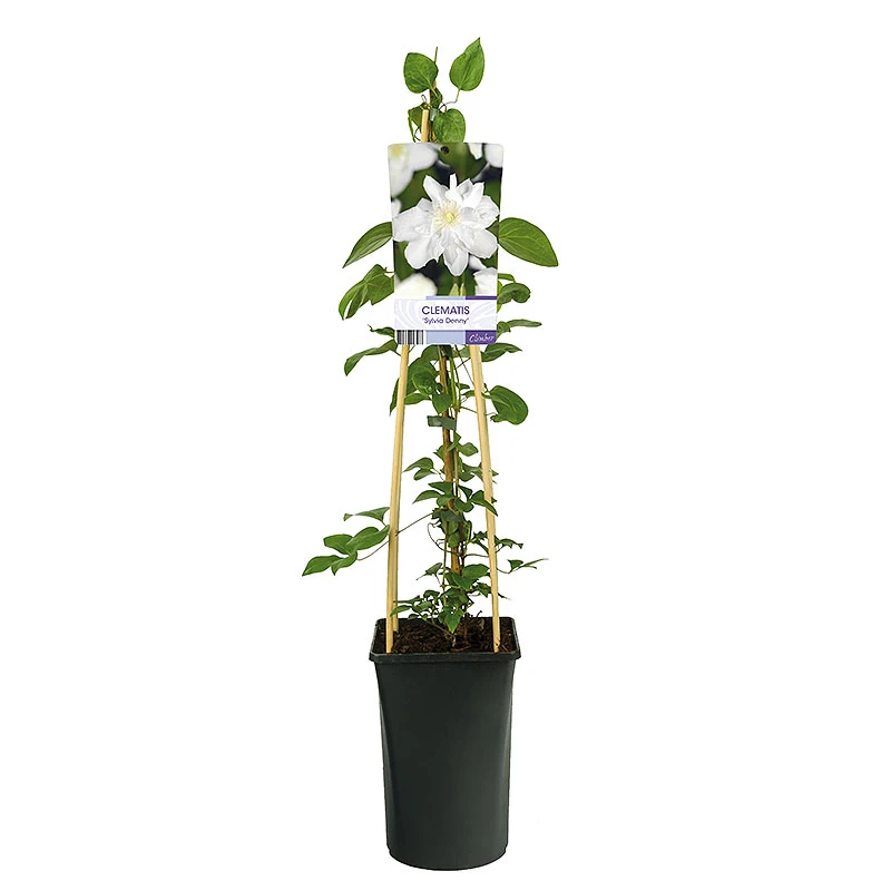 Klematis ‘Sylvia Denny’ är en sort som blommar två gånger per år. En tidigt blomning i maj-juni med stora dubbla, vita, halvfyllda blommor med krämgul ståndare på gamla rankor. Och andra blomning på nya rankor i augusti-september. Beskärning av tunga rankor sker under våren ca 20 cm över marken. Passar perfekt att odla mot vägg, träd, mur eller spaljé.