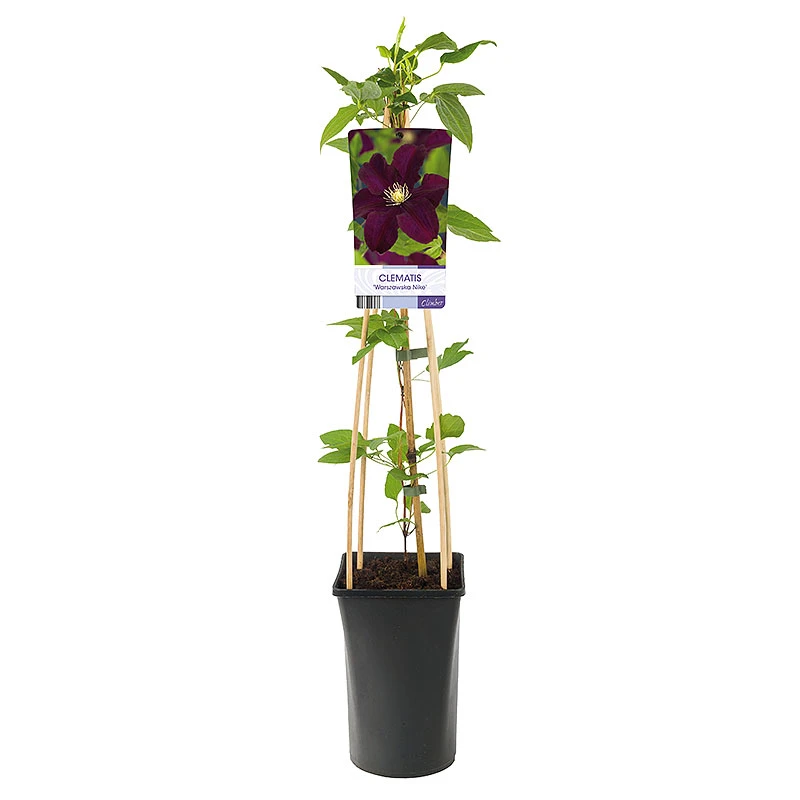 Klematis ‘Warszawska Nike’ blommar med dekorativa, stora (10-15 cm), enkla, rödlila blommor med sammetskänsla som har gul ståndare under juni-augusti. Beskärning sker under tidigt vår eller sent på hösten, ca 50 cm över marken. Är en nyare polsk sort som man kan odla mot träd eller spaljé.
