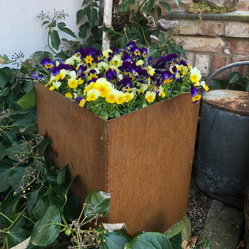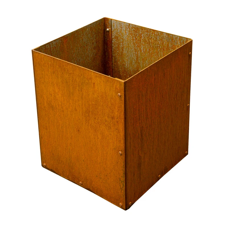Dekorativ utekruka i 2 mm cortenstål. Cortenstål är ett hållbart material, som efter cirka två år avstannar i sin rostning och bildar ett skyddande lager. Krukan får därmed en väldigt god hållbarhet.