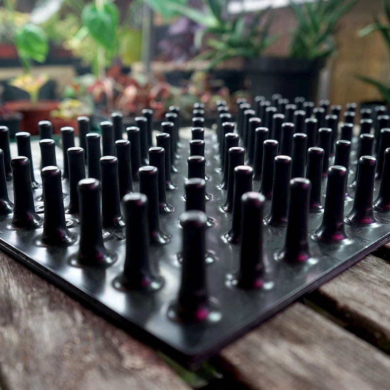 Uttryckningsplatta med 96 piggar för snabb och enkel avlägsning av växter från pluggbrätten med 96 celler.