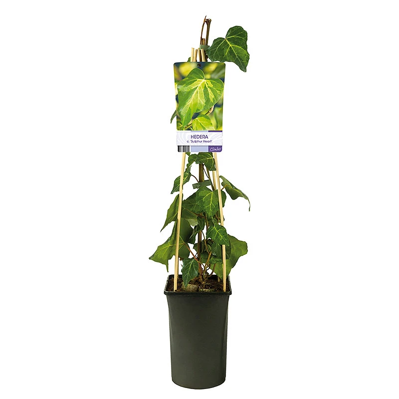 Storbladig vintergrön murgröna ‘Sulphur Heart’ har extra stora, gulgröna, hjärtformade blad. Bladen är mörkgröna på kanten med gulgrön prick i mitten. Blad är ca 15 cm långa och 12 cm breda. Blommar med små gulgröna blommor på hösten och har dekorativa bär. Passar perfekt att odla mot en vägg, mur eller som grundskydd.