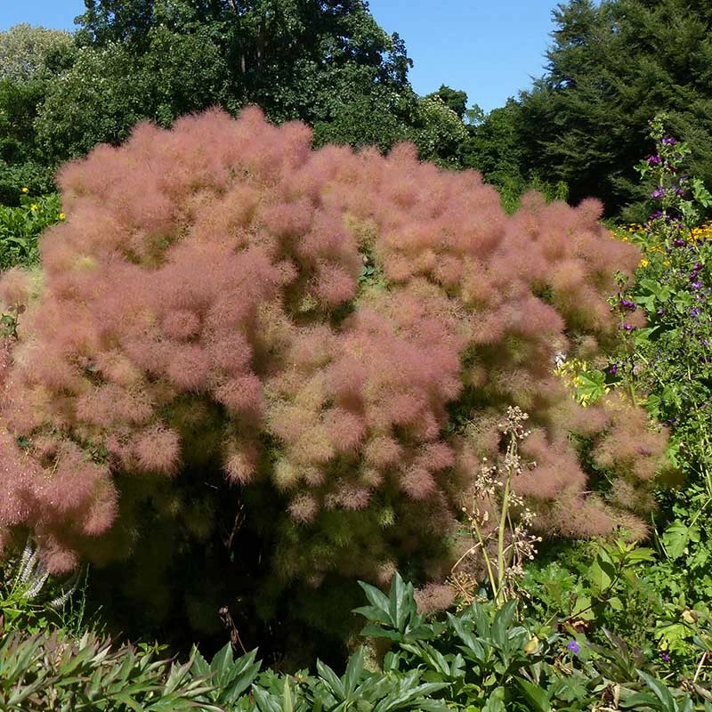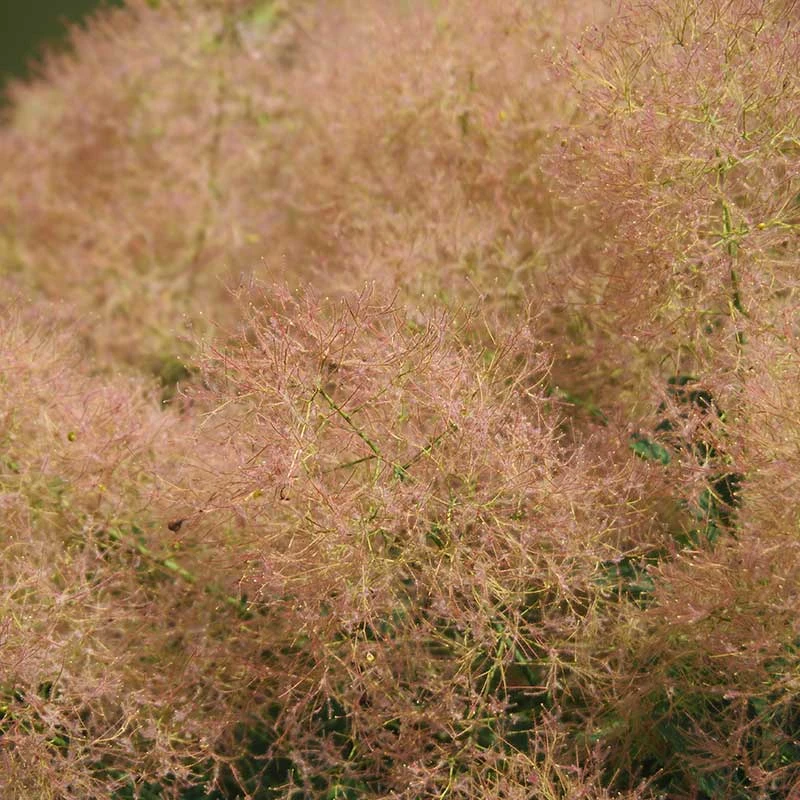 Perukbuske ‘Young Lady’ är en rund och kompakt buske. Ljusrosa blomsamlingar i perukliknande plymer som bleknar till gulvitt. Blommorna liknar en peruk. Sorten får gul – orange – röda färger på hösten. Passar utmärkt som solitär eller i gruppplantering som kontrast med andra buskar eller barrväxter. Sorten är torktålig.