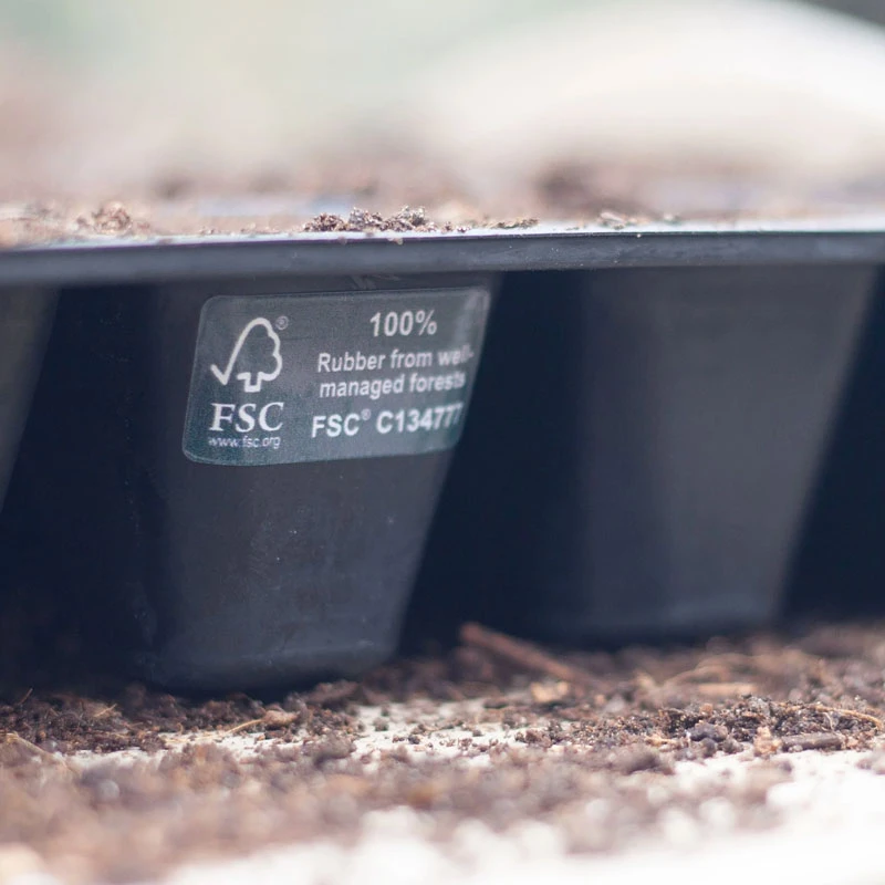 Med materialet gummi blir pluggbrättet robust, flexibelt och hållbart. Smidigheten hos det naturgummi som används gör det enkelt att ta ur plantorna.