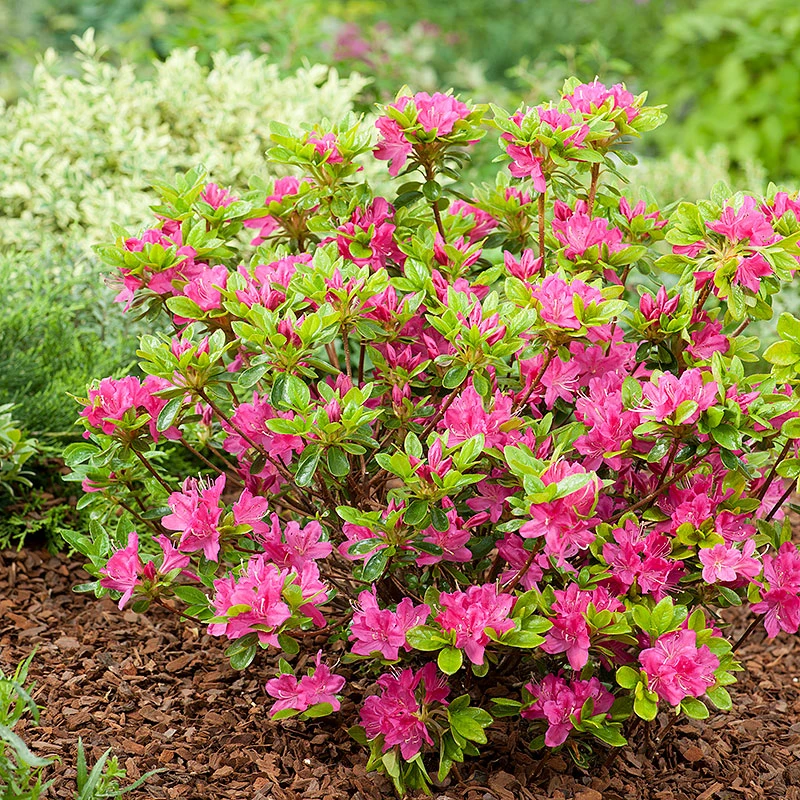 Japansk azalea, vilket är en släkting till rhododendron blommar med en fantastik klar och sprudlande rosaröd färg. Denna söta lilla buske är vintergrön och pryds av små läderartade blad som sitter kvar året runt. Rödrosa blomsterknopparna som täcker hela busken slår ut i en häpnadsväckande överdådig blomning i maj. Blomningen sker i mindre klasar av klockformade blommor där varje blomma har en egen stjälk, mycket vackra att plocka som dekoration i fågelbad eller vattenfyllda fat. Denna kraftfullt blommande Azalea går lika bra att plantera i kruka eller som solitär vid stenplatser, damm eller i lummiga rabatter ackompanjerad av rhododendron. Dock bör man liksom med rhododendron tänka på att den kräver torvblandad lucker surjord och trivs bäst i halvskugga gärna vindskyddat något fuktiga lägen.