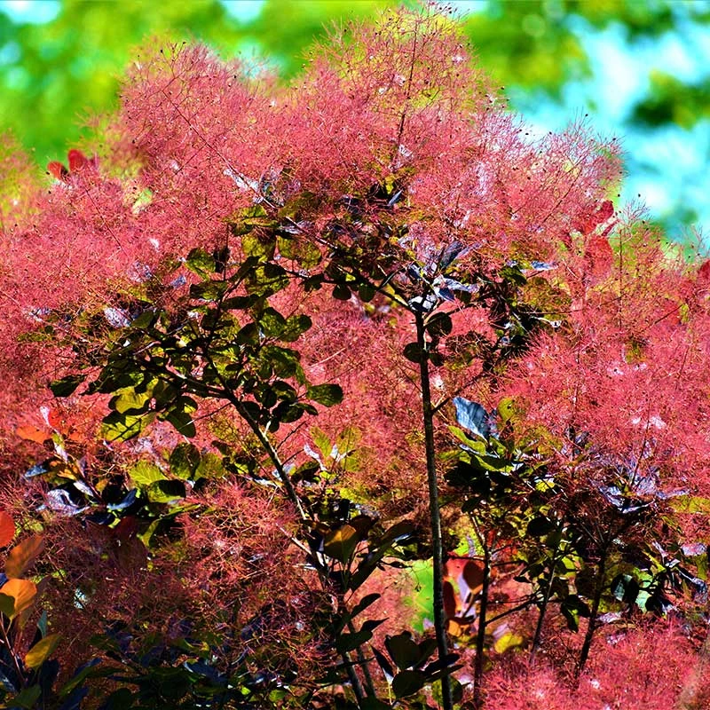 Rödbladig perukbuske ‘Royal Purple’ är en mycket dekorativ buske med mörkt rödlila blad och gulröda perukliknade plymer. Passar utmärkt som solitär eller i samplantering med andra buskar. Tåla torka. Trivs bäst i sol och vindskyddat läge. Efter blomning utvecklas hårtussliknande rosaröda plym som ser ut som peruk över bladen. På hösten skiftar blad till gula färger med röda nyanser. Perukbusken kan man forma med klippning till ett litet träd.