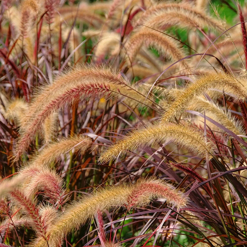 Fjäderborstgräs har djupröda nästan vinröda smala blad. Utmärkt i en kruka vid entré eller terrass i kombination med buskar, sommarblommor eller barrväxter. Övervintras frostfritt. Har långa lätt överhängande ljusrosa/purpurfärgade ax. Vippor kan skäras och torkas för blomarrangemang.