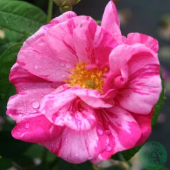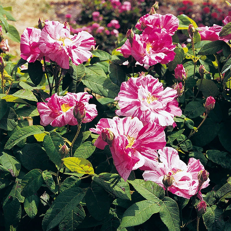 Rosa ‘Mundi’ är en buskros som kallas polkagris. Blommorna är karakteristiska strimmiga i vitt, rosa och karminrött, som påminner polkagris. Blommar rikligt med stora halvfyllda blommor i juni-juli, efter blomning kommer medelstora orangea nypon. Doften är stark med nyanser av mandel, körvel och mysk. Växtsätt är buskigt, kraftig och sorten blir ca 100-120 cm hög. Bladen är mörkgröna och glansiga. Plantera som solitär eller i grupp. Trivs både i sol, halvskugga eller skugga, gärna i väldränerad, mullrik och näringsrik jord. Beskär på våren.