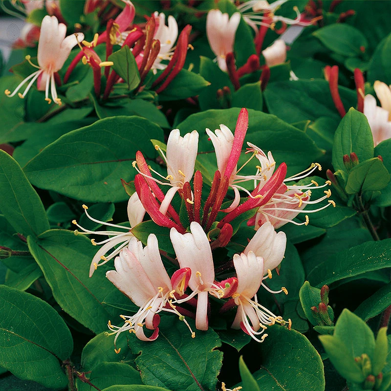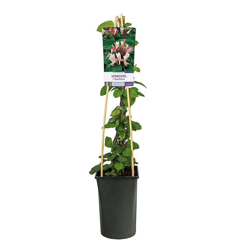 Lonicera japonica ‘Red World’ blommar med doftande rörformiga röd-rosa-vita blommor under juni-augusti. Ovala mörkgröna blad med röd-bruna grenar som är en fantastisk kombination för plantering mot en vägg, staket eller träd. Kan bli vintergrön under milda vintrar. Älskas av fjärilar, bin och humlor.
