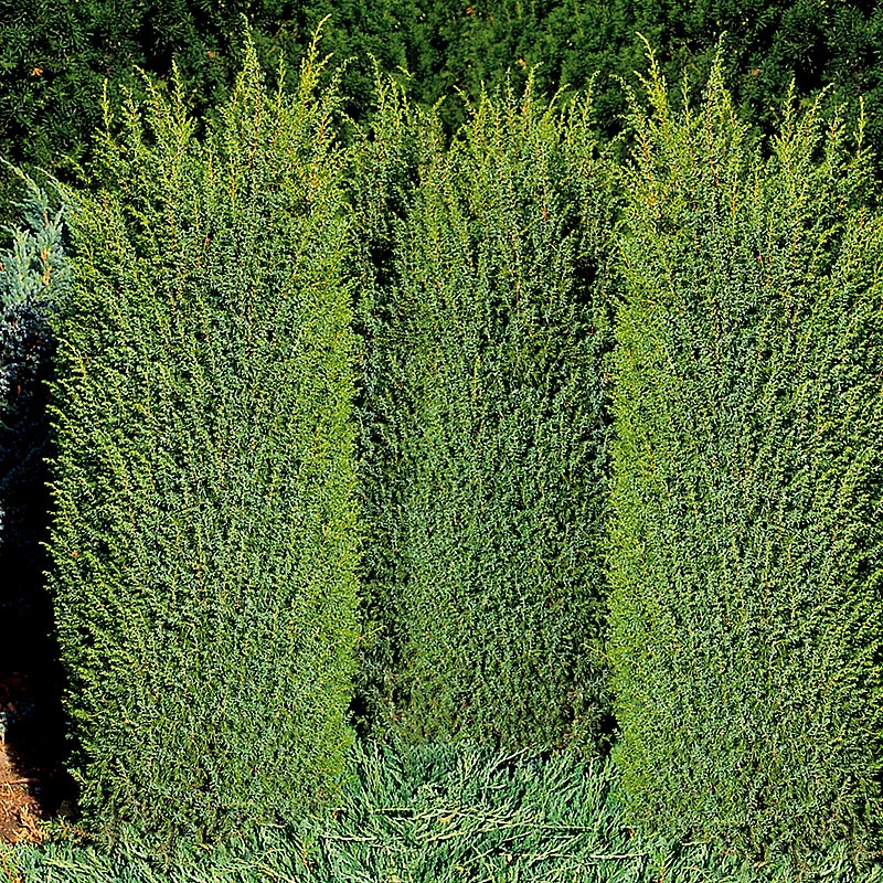 Smalt och upprätt pelarformat växtsätt med små gröna barr med skimrande silver på undersidan, gröna även på vintern.