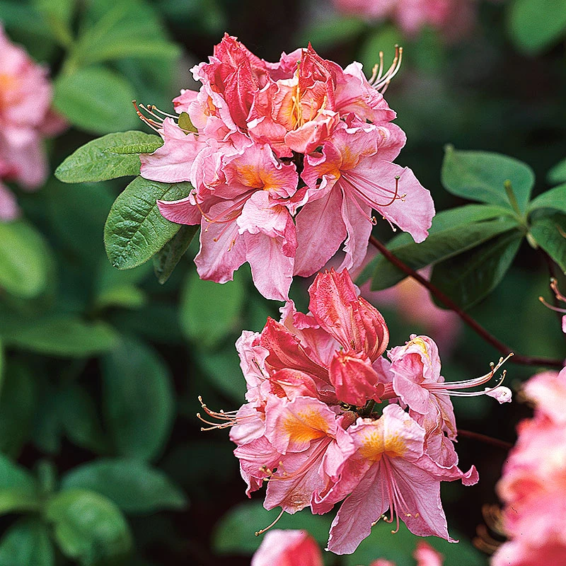 En av de färgstarkaste azaleorna som blommar med en mängd ljusrosa blommor med en bred gul färgstråk som sträcker sig från blommans mitt till kronbladets ytterkant. Kronbladen är djupt skurna och de långa graciösa ståndarna och pistillerna ger ett tropiskt intryck. Bladverket är mörkgrönt men skiftar efter sommaren till en lysande röd höstskrud. Dess blomsterprakt är spektakulär och det är svårt att föreställa sig att de trivs i våra breddgrader. Dock är Azaleor mycket tacksamma. Placera i vindskyddade, halvskuggiga lägen, gärna med porös surjord.