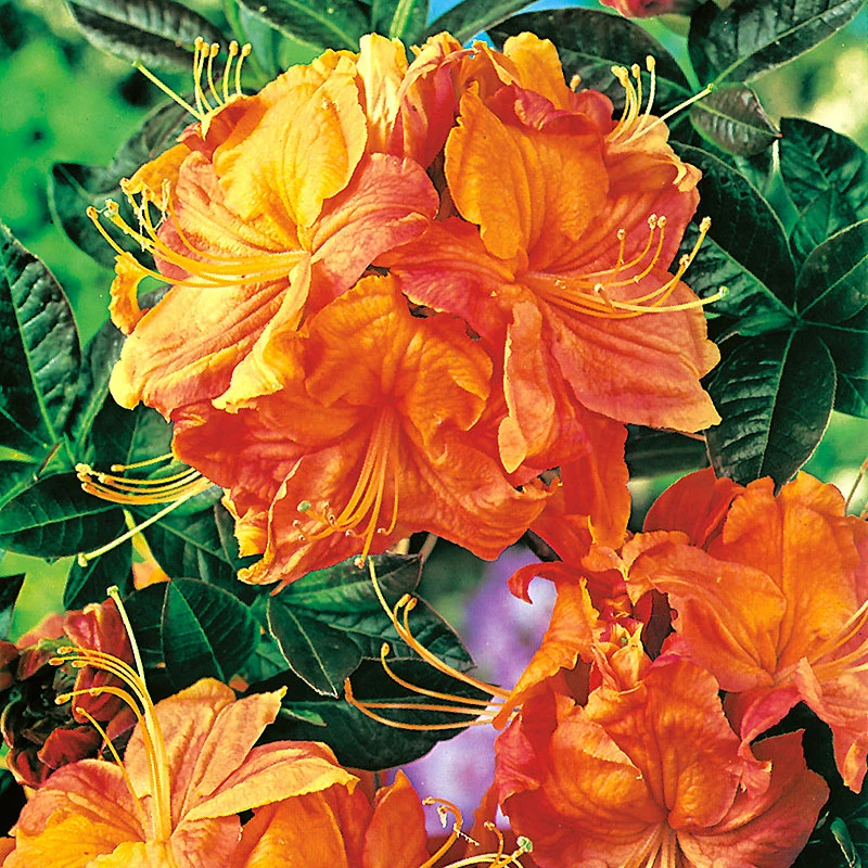 Heta och eldiga kraftigt orangegula trumpetformade blommor med långa graciösa ståndare och pistiller. De färgsprakande blommorna översållar den magnifika busken i maj-juni. Bladverket framhäver blommorna med en vacker läderartad grön färg som på hösten skiftar över i underbara färgsprakande nyanser. Busken blir ca 1,5-2 meter hög och har ett buskigt och upprätt växtsätt och trivs tillsammans med andra kalkskyende plantor, porös jord och gärna sol-halvskugga. För att framhäva dess blomsterprakt plantera gärna i synliga delar av rabatten eller med lägre växande grönska/ stenpartier runt omkring eller låt den ackompanjeras av andra vackert blommande azaleor och rhododendron.