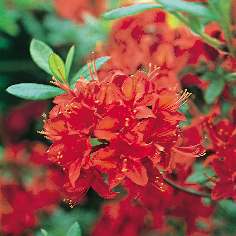 Intensivt rödblossande stjärnformade blommor som blommar med en otrolig intensitet och passion. Den vackra blomningen är häpnadsväckande då de röda färgen lyser upp tidig sommar innan annan blomsterprakt hunnit utvecklas, maj-juni. Bladen är mörkgröna aningen glansiga och skiftar på hösten till vackra röda färgskiftningar. Bladverket formar en upprättväxt luftig liten buske ca 1,5 meter i höjd som trivs i porös torvblandad surjord gärna tillsammans med andra azaleor eller surjordsväxter.